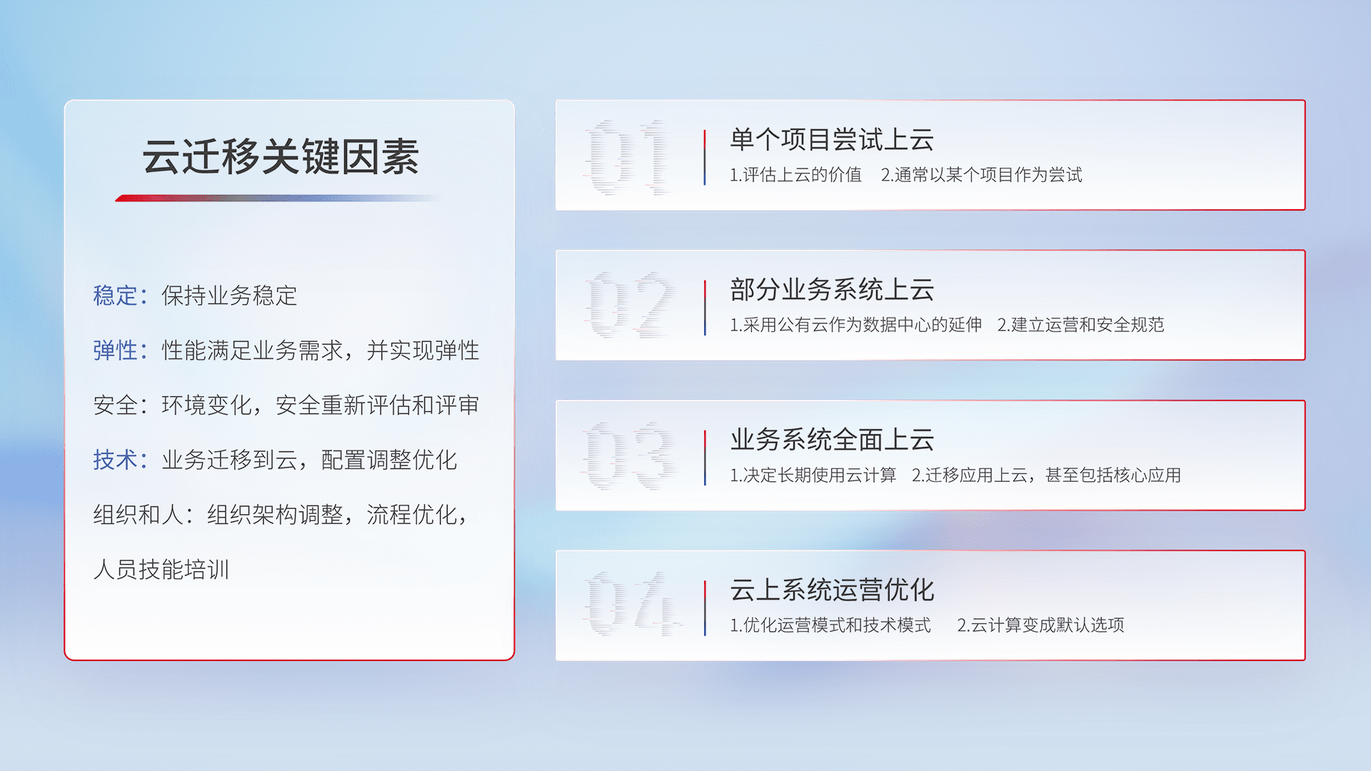 结合实际业务,,,,从规划设计、、云平台选型、、、云原生改造、、数据迁移、、、集成交付,,迁移全过程为客户识别最佳上云路径,,做好风险识别管理,,设计网络架构、、身份权限、、、、安全审计合规、、、、操作审计、、、、日志审计、、、、监控告警策略、、、多站点容灾设计等,,,,对云上基础设施进行整体规划,,提升IT治理水平,,,,以满足弹性、、、、高可用、、高性能的需求。。
