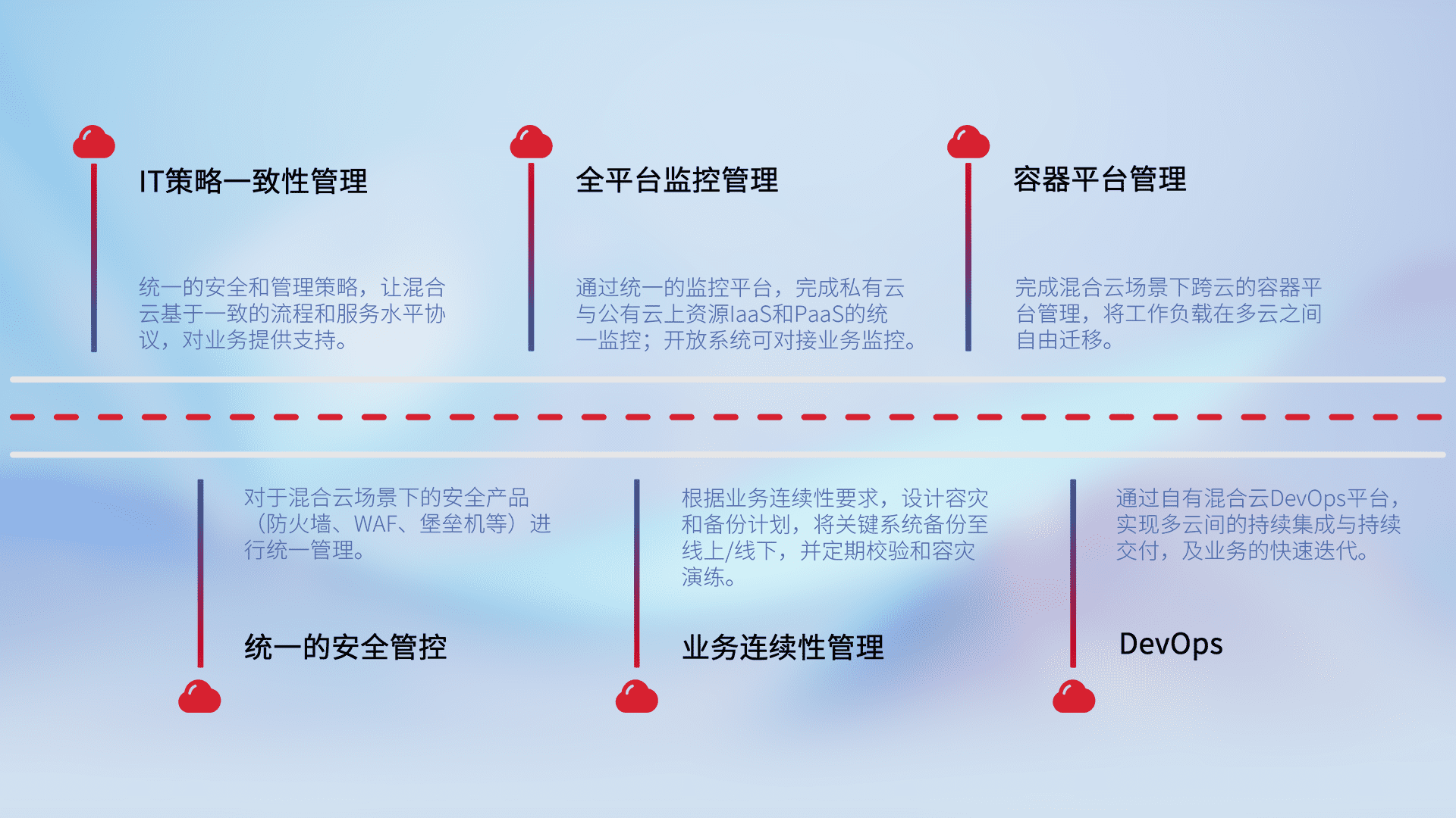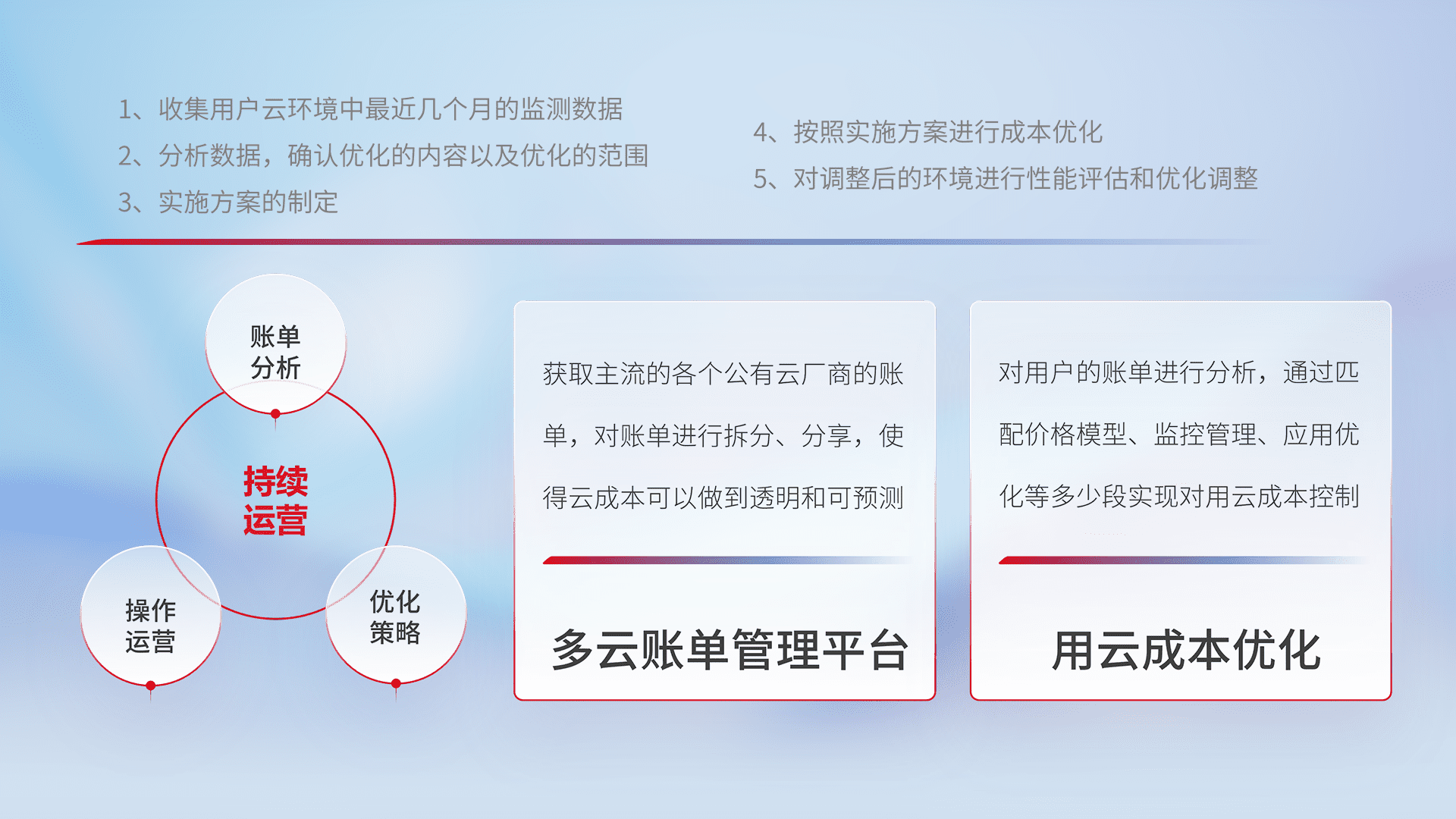 通过多云纳管,,以统一的资源数据模型把客户的云资源进行抽象和封装,,进而实现对多云资源的统一操作,,,,保障云资源管理的可靠性、、稳定性与可用性。。。量身定制化运维内容,,,,配置、、、开发运维、、、、补丁管理、、、备份、、、监控、、认证和访问管理、、、、审计和日常巡检等,,,,保障在用云过程中的可靠度,,稳定度以及高可用率。。