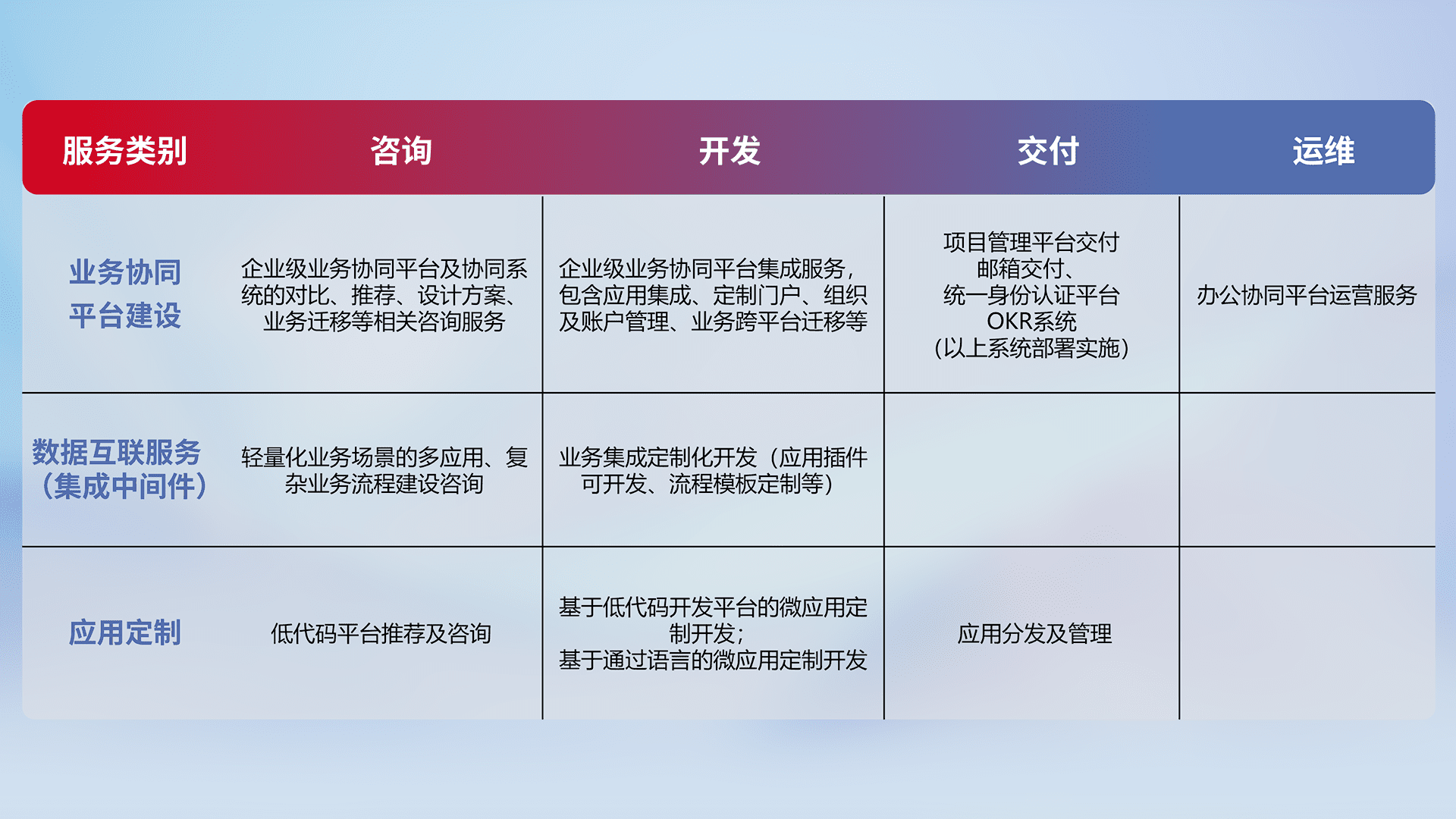 针对钉钉、、、企微、、、IDaas等平台级产品提供产品的规划、、、、方案、、、、交付、、、定制化开发等服务,,实现如统一协同办公、、、智能客户服务、、混合会议管理、、、、智能数据查询、、等业务场景,,,,实现数字化转型。。。